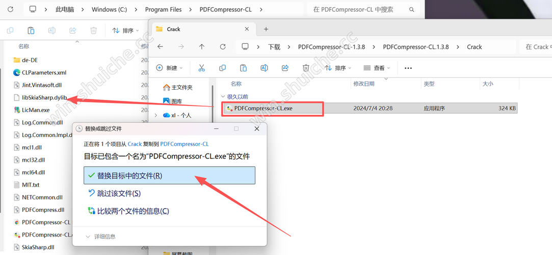 文件夹,将破解补丁复制粘贴到软件目录中并点击替换即可破解完成,软件默认安装路径:C:\Program Files\PDFCompressor-CL