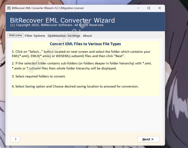 BitRecover EML Converter Wizard允许您批量将EML文件转换为其他格式。以下是使用此软件批量转换EML文件的步骤: