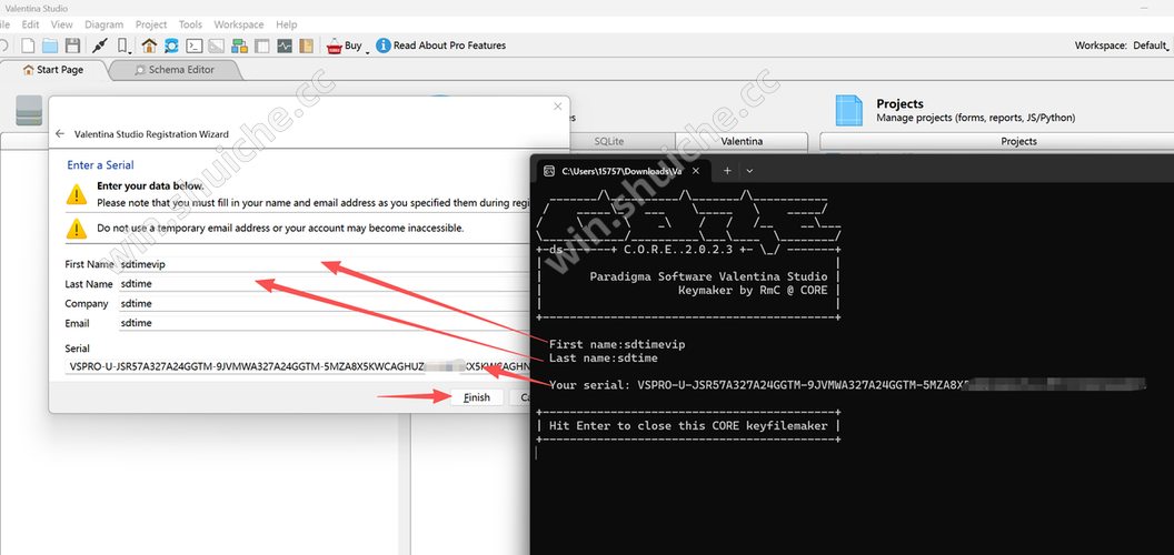 将名字输入到对应位置,随意输入公司名字和邮箱,将注册码输入到正确位置点击