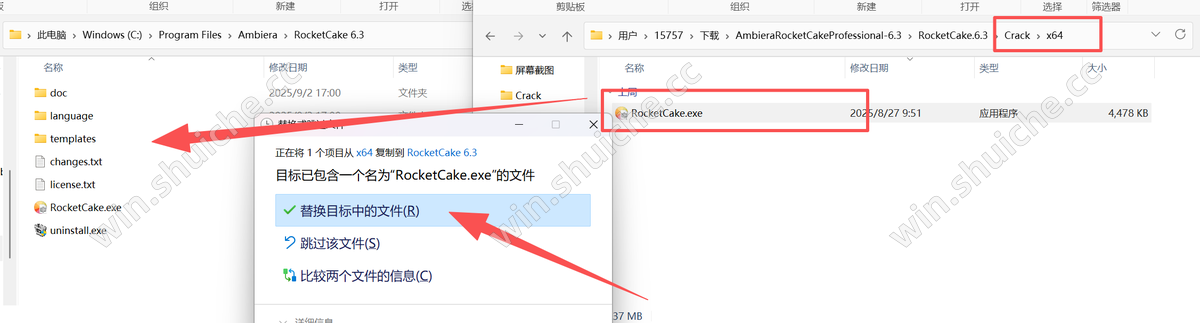 crack文件夹里对应系统位数的破解补丁复制粘贴到软件目录(即文件所在位置)中并点击替换文件即可破解完成,该目录默认为:C:\Program Files \Ambiera\RocketCake 6.3
