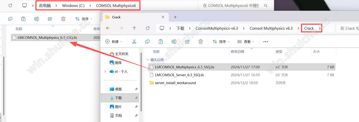 Crack文件夹中的LMCOMSOL_Multiphysics_6.3_SSQ.lic复制到一个指定文件夹,比如直接放在盘根目录下,或者新建一个文件夹