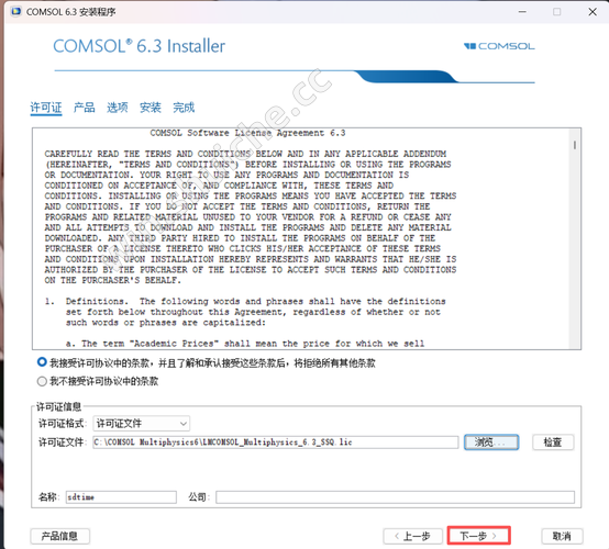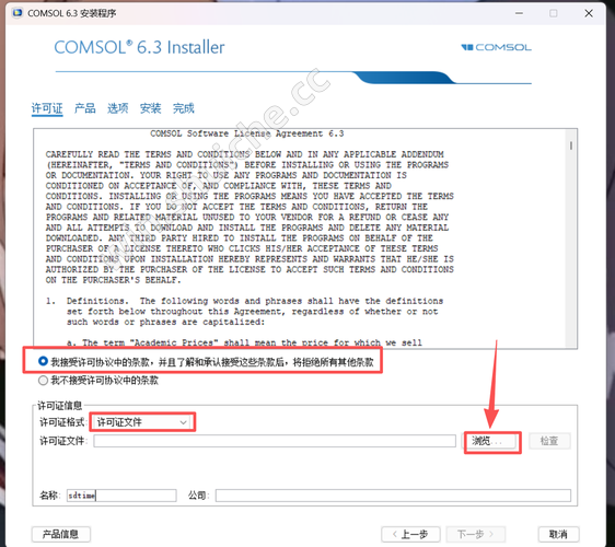“我接受许可协议中…”,然后将许可证格式栏修改为“许可证文件”,再点击【浏览】按钮加载许可证文件 (第一步骤里让复制的文件就是许可证文件,在你复制的位置找到它即可)